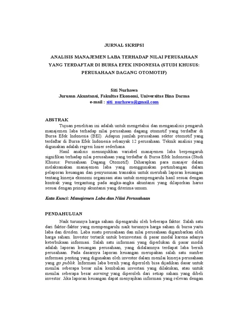Pengaruh ukuran perusahaan leverage profitabilitas dan kebijakan dividen terhadap nilai perusahaan studi pada perusahaan manufaktur yang terdaftar di bursa eek indonesia tahun 2006 2008. Pengaruh kepemilikan manajerial ukuran perusahaan dan profitabilitas terhadap nilai perusahaan pada perusahaan makanan dan minuman yang terdaftar di bursa efek indonesia skripsi diajukan sebagai salah satu persyaratan guna memperoleh gelar sarjana ekonomi s1 strata satu pada program studi manajemen universitas negeri padang oleh. Berikut ini adalah jurnal skripsi manajemen sdm sumber daya manusia yang merupakan kumpulan file dari berbagi sumber jurnal nasional tentang artikel skripsi nilai perusahaan yang bisa bapakibu gunakan dan diunduh secara gratis dengan menekan tombol download biru dibawah ini.