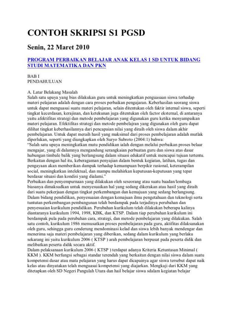 Download contoh skripsi pendidikan pgsd lengkap file pdf sekali klik 100 contoh judul penelitian kualitatif pgsd berkualitas. Program perbaikan belajar anak kelas 1 sd untuk bidang studi matematika dan pkn.
